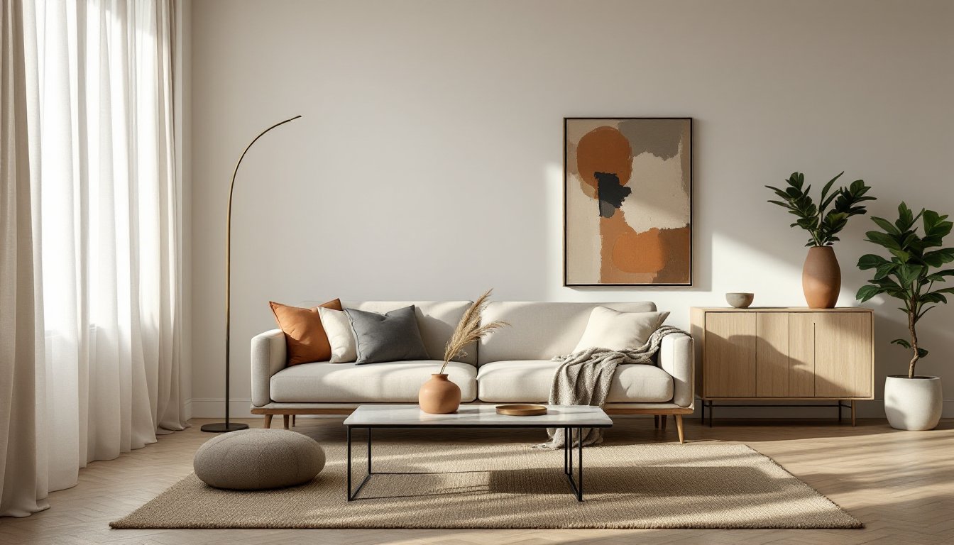 Textiles are the easiest avenue. Layer a chunky knit throw in undyed wool over a linen sofa. Choose a jute or sisal area rug in a natural fiber to ground the seating area: an 8×10 rug typically works for a standard living room, with front furniture legs resting on the rug and rear legs off.